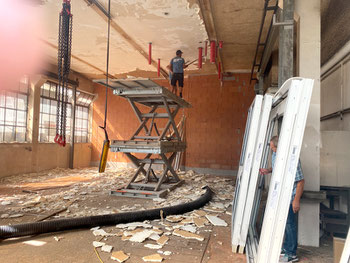 Nach einer kleinen Sommerpause haben wir die nächsten Schritte besprochen – von der neuen Raumaufteilung bis hin zur Farbgestaltung. Momentan wird der alte Brandschutzschaum entfernt, bevor es mit dem nächsten großen Meilenstein weitergeht: dem Bau der Bühne bzw. der Galerie.